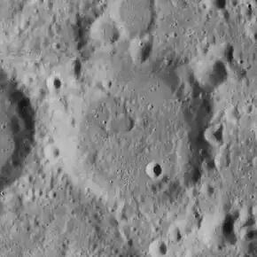This crater has been eroded by a long history of subsequent impacts, so that the rim has been worn down and the edge rounded. Several small craterlets lie along the edge of the rim, and there is a tiny crater on the interior floor near the east-southeastern rim. The interior floor is somewhat irregular and lacks a central peak at the midpoint.