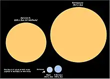 On 13 December 1920, Betelgeuse became the first star outside the Solar System to have the angular size of its photosphere measured.[36] Although interferometry was still in its infancy, the experiment proved a success. The researchers, using a uniform disk model, determined that Betelgeuse had a diameter of 0.047″, although the stellar disk was likely 17% larger due to the limb darkening, resulting in an estimate for its angular diameter of about 0.055".[36][57] Since then, other studies have produced angular diameters that range from 0.042 to 0.069″.[40][55][115] Combining these data with historical distance estimates of 180 to 815 ly yields a projected radius of the stellar disk of anywhere from 1.2 to 8.9 AU. Using the Solar System for comparison, the orbit of Mars is about 1.5 AU, Ceres in the asteroid belt 2.7 AU, Jupiter 5.5 AU—so, assuming Betelgeuse occupying the place of the Sun, its photosphere might extend beyond the Jovian orbit, not quite reaching Saturn at 9.5 AU.