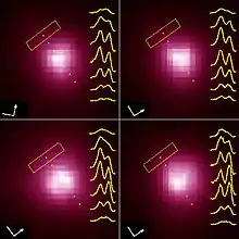 In 1995, the Hubble Space Telescope's Faint Object Camera captured an ultraviolet image with a resolution superior to that obtained by ground-based interferometers—the first conventional-telescope image (or "direct-image" in NASA terminology) of the disk of another star.[51] Because ultraviolet light is absorbed by the Earth's atmosphere, observations at these wavelengths are best performed by space telescopes.[52] This image, like earlier pictures, contained a bright patch indicating a region in the southwestern quadrant 2,000 K hotter than the stellar surface.[53] Subsequent ultraviolet spectra taken with the Goddard High Resolution Spectrograph suggested that the hot spot was one of Betelgeuse's poles of rotation. This would give the rotational axis an inclination of about 20° to the direction of Earth, and a position angle from celestial North of about 55°.[54]