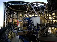 In a study published in December 2000, the star's diameter was measured with the Infrared Spatial Interferometer (ISI) at mid-infrared wavelengths producing a limb-darkened estimate of 55.2±0.5 mas – a figure entirely consistent with Michelson's findings eighty years earlier.[36][55] At the time of its publication, the estimated parallax from the Hipparcos mission was 7.63±1.64 mas, yielding an estimated radius for Betelgeuse of 3.6 AU. However, an infrared interferometric study published in 2009 announced that the star had shrunk by 15% since 1993 at an increasing rate without a significant diminution in magnitude.[56][57] Subsequent observations suggest that the apparent contraction may be due to shell activity in the star's extended atmosphere.[58]
