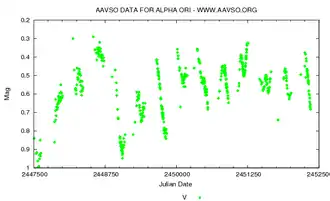 Betelgeuse typically shows only small brightness changes near to magnitude +0.5, although at its extremes it can become as bright as magnitude 0.0 or as faint as magnitude +1.6. Betelgeuse is listed in the General Catalogue of Variable Stars with a possible period of 2,335 days.[8] More detailed analyses have shown a main period near 400 days, a short period of 185 days,[11] and a longer secondary period around 2,100 days.[102][111] The lowest reliably-recorded V-band magnitude of +1.614 was reported in February 2020.