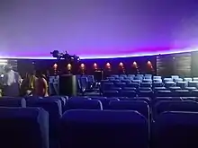 The planetarium is equipped with a versatile opto-mechanical GOTO GM II starfield projector,[6] an accompanying special-effects projector and an X-Y table system for simulating various celestial phenomena. The GM II projector has the provision to execute the diurnal, annual, latitudinal, and precessional motions. The pierced hemispherical inner dome of the planetarium, made of aluminium, is 15 m in diameter. The air-conditioned theatre has a seating capacity of 236.