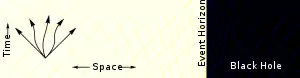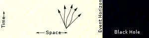 The modern theory of gravity, general relativity, discredits Michell's notion of a light ray shooting directly from the surface of a supermassive star, being slowed down by the star's gravity, stopping, and then free-falling back to the star's surface.[15] Instead, spacetime itself is curved such that the geodesic that light travels on never leaves the surface of the "star" (black hole).
