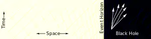 As predicted by general relativity, the presence of a mass deforms spacetime in such a way that the paths taken by particles bend towards the mass.[87] At the event horizon of a black hole, this deformation becomes so strong that there are no paths that lead away from the black hole.[88]