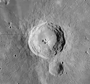 Bullialdus is a lunar impact crater located in the western part of the Mare Nubium. It was named after French astronomer Ismaël Boulliau.[1] To the north by north-west is the broken-rimmed and lava-flooded crater Lubiniezky. South-west of Bullialdus lies the smaller crater König.