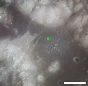 ![]() Location of Camelot crater in Taurus-Littrow Valley. South Massif is at lower left, North Massif is at top center, and Sculptured Hills are at upper right. Scale bar is 5 km | |