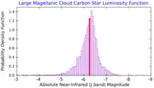 Classical carbon stars are very luminous, especially in the near-infrared, so they can be detected in nearby galaxies. Because of the strong absorption features in their spectra, carbon stars are redder in the near-infrared than oxygen-rich stars are, and they can be identified by their photometric colors.[16] While individual carbon stars do not all have the same luminosity, a large sample of carbon stars will have a luminosity probability density function (PDF) with nearly the same median value, in similar galaxies. So the median value of that function can be used as a standard candle for the determination of the distance to a galaxy. The shape of the PDF may vary depending upon the average metallicity of the AGB stars within a galaxy, so it is important to calibrate this distance indicator using several nearby galaxies for which the distances are known through other means.[15][17]