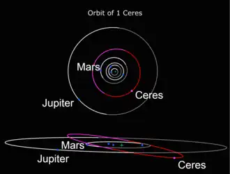 Ceres follows an orbit between Mars and Jupiter, near the middle of the asteroid belt, with an orbital period (year) of 4.6 Earth years.[2] Compared to other planets and dwarf planets, Ceres's orbit is moderately tilted relative to that of Earth; its inclination (i) is 10.6°, compared to 7° for Mercury and 17° for Pluto. It is also slightly elongated, with an eccentricity (e) = 0.08, compared to 0.09 for Mars.[2]