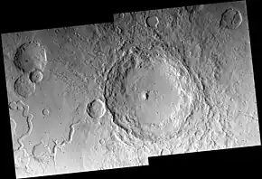 Impact craters generally have a rim with ejecta around them; in contrast, volcanic craters usually do not have a rim or ejecta deposits. As craters get larger (greater than 10 km in diameter) they usually have a central peak.[3] The peak is caused by a rebound of the crater floor following the impact.[4] If one measures the diameter of a crater, the original depth can be estimated with various ratios. Because of this relationship, researchers have found that many Martian craters contain a great deal of material; much of it is believed to be ice deposited when the climate was different.[5] Sometimes, craters expose layers that were buried. Cerulli shows evidence of glacial activity in the past. The density of impact craters is used to determine the surface ages of Mars and other solar system bodies.[3] The older the surface, the more craters present. Crater shapes can reveal the presence of ground ice.