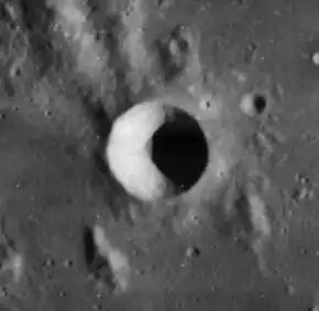 Chladni is a small lunar impact crater that lies near the northwest edge of Sinus Medii, in the central part of the Moon. The crater is named for German physicist and musician Ernst Chladni who,[1] in 1794, wrote the first book on meteorites.[2] The rim of the crater is roughly circular, and there is a small central floor at the midpoint of the sloping inner walls. This feature has a higher albedo than the surrounding terrain. It is connected by a low ridge to the rim of the crater Murchison, which lies to the northwest. Due east of Chladni is the larger Triesnecker.