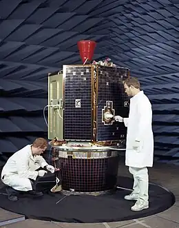The spacecraft was an octagonal prism 1.88 m high and 1.14 m across[4] with two solar panels protruding on opposite sides parallel to the axis of the prism. A 42-inch-diameter (1,100 mm) high-gain fixed dish antenna was at one end of the prism, and the 489 N thruster at the other end. The sensor openings were all located together on one of the eight panels, 90 degrees from the solar panels, and protected by a single sensor cover.