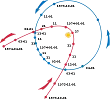 The first observations were made in the 1980s and 1990s as several spacecraft flew by comets 21P/Giacobini–Zinner,[60] 1P/Halley,[61] and 26P/Grigg–Skjellerup.[62] It was then found that the bow shocks at comets are wider and more gradual than the sharp planetary bow shocks seen at, for example, Earth. These observations were all made near perihelion when the bow shocks already were fully developed.