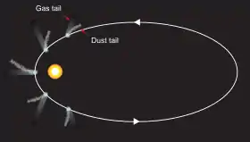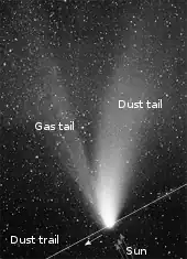 The streams of dust and gas each form their own distinct tail, pointing in slightly different directions. The tail of dust is left behind in the comet's orbit in such a manner that it often forms a curved tail called the type II or dust tail.[55] At the same time, the ion or type I tail, made of gases, always points directly away from the Sun because this gas is more strongly affected by the solar wind than is dust, following magnetic field lines rather than an orbital trajectory.[68] On occasions—such as when Earth passes through a comet's orbital plane, the antitail, pointing in the opposite direction to the ion and dust tails, may be seen.[69]
