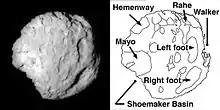 Comet nuclei with radii of up to 30 kilometers (19 mi) have been observed,[27] but ascertaining their exact size is difficult.[28] The nucleus of 322P/SOHO is probably only 100–200 meters (330–660 ft) in diameter.[29] A lack of smaller comets being detected despite the increased sensitivity of instruments has led some to suggest that there is a real lack of comets smaller than 100 meters (330 ft) across.[30] Known comets have been estimated to have an average density of 0.6 g/cm3 (0.35 oz/cu in).[31] Because of their low mass, comet nuclei do not become spherical under their own gravity and therefore have irregular shapes.[32]