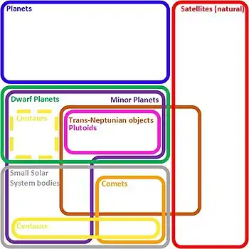 Extinct comets that have passed close to the Sun many times have lost nearly all of their volatile ices and dust and may come to resemble small asteroids.[3] Asteroids are thought to have a different origin from comets, having formed inside the orbit of Jupiter rather than in the outer Solar System.[4][5] However, the discovery of main-belt comets and active centaur minor planets has blurred the distinction between asteroids and comets. In the early 21st century, the discovery of some minor bodies with long-period comet orbits, but characteristics of inner solar system asteroids, were called Manx comets. They are still classified as comets, such as C/2014 S3 (PANSTARRS).[6] Twenty-seven Manx comets were found from 2013 to 2017.[7]