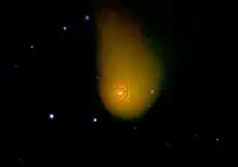 Both the coma and tail are illuminated by the Sun and may become visible when a comet passes through the inner Solar System, the dust reflects sunlight directly while the gases glow from ionisation.[55] Most comets are too faint to be visible without the aid of a telescope, but a few each decade become bright enough to be visible to the naked eye.[56] Occasionally a comet may experience a huge and sudden outburst of gas and dust, during which the size of the coma greatly increases for a period of time. This happened in 2007 to Comet Holmes.[57]