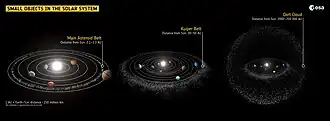 The Oort cloud is thought to occupy a vast space starting from between 2,000 and 5,000 AU (0.03 and 0.08 ly)[109] to as far as 50,000 AU (0.79 ly)[85] from the Sun. This cloud encases the celestial bodies that start at the middle of the Solar System—the Sun, all the way to outer limits of the Kuiper Belt. The Oort cloud consists of viable materials necessary for the creation of celestial bodies. The Solar System's planets exist only because of the planetesimals (chunks of leftover space that assisted in the creation of planets) that were condensed and formed by the gravity of the Sun. The eccentric made from these trapped planetesimals is why the Oort Cloud even exists.[110] Some estimates place the outer edge at between 100,000 and 200,000 AU (1.58 and 3.16 ly).[109] The region can be subdivided into a spherical outer Oort cloud of 20,000–50,000 AU (0.32–0.79 ly), and a doughnut-shaped inner cloud, the Hills cloud, of 2,000–20,000 AU (0.03–0.32 ly).[111] The outer cloud is only weakly bound to the Sun and supplies the long-period (and possibly Halley-type) comets that fall to inside the orbit of Neptune.[85] The inner Oort cloud is also known as the Hills cloud, named after Jack G. Hills, who proposed its existence in 1981.[112] Models predict that the inner cloud should have tens or hundreds of times as many cometary nuclei as the outer halo;[112][113][114] it is seen as a possible source of new comets that resupply the relatively tenuous outer cloud as the latter's numbers are gradually depleted. The Hills cloud explains the continued existence of the Oort cloud after billions of years.[115]