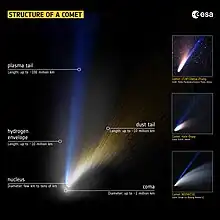 As of November 2021, there are 4,584 known comets.[8] However, this represents a very small fraction of the total potential comet population, as the reservoir of comet-like bodies in the outer Solar System (in the Oort cloud) is about one trillion.[9][10] Roughly one comet per year is visible to the naked eye, though many of those are faint and unspectacular.[11] Particularly bright examples are called "great comets". Comets have been visited by uncrewed probes such as NASA's Deep Impact, which blasted a crater on Comet Tempel 1 to study its interior, and the European Space Agency's Rosetta, which became the first to land a robotic spacecraft on a comet.[12]