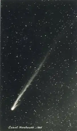 Comet Morehouse (modern formal designation: C/1908 R1) was a bright, non-periodic comet discovered by US astronomer Daniel Walter Morehouse and first observed on September 1, 1908, at Yerkes Observatory in Williams Bay, Wisconsin. Morehouse was a graduate student at the time. It was unusual in the rapid variations seen in the structure of its tail. At times, the tail seemed to split into up to six separate tails; at others, the tail appeared completely detached from the head of the comet. The tail was further unusual in that it formed while the comet was still 2 AU away from the Sun (where distances of 1.5 AU are more usual), and that there was a high concentration of the CO+ ion in its spectrum.