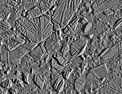 Conamara Chaos is a landscape produced by the disruption of the icy crust of Europa. The region consists of rafts of ice that have moved around and rotated. Surrounding these plates is a lower matrix of jumbled ice blocks which may have been formed as water, slush, or warm ice rose up from below the surface. The region is cited as evidence for a liquid ocean below Europa's icy surface.