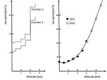 In 1912, Victor Hess carried three enhanced-accuracy Wulf electrometers[3] to an altitude of 5,300 metres in a free balloon flight. He found the ionization rate increased approximately fourfold over the rate at ground level.[3] Hess ruled out the Sun as the radiation's source by making a balloon ascent during a near-total eclipse. With the moon blocking much of the Sun's visible radiation, Hess still measured rising radiation at rising altitudes.[3] He concluded that "The results of the observations seem most likely to be explained by the assumption that radiation of very high penetrating power enters from above into our atmosphere."[25] In 1913–1914, Werner Kolhörster confirmed Victor Hess's earlier results by measuring the increased ionization enthalpy rate at an altitude of 9 km.[26][27]