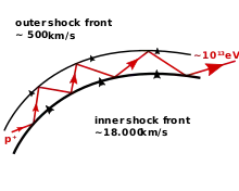 Supernovae do not produce all cosmic rays, however, and the proportion of cosmic rays that they do produce is a question which cannot be answered without deeper investigation.[57] To explain the actual process in supernovae and active galactic nuclei that accelerates the stripped atoms, physicists use shock front acceleration as a plausibility argument (see picture at right).