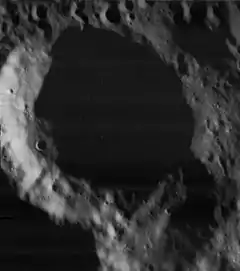 This circular crater is slightly unusual for its lack of interesting features. No notable craters lie along its rim or the flat, level interior. The inner walls are devoid of terraces and just slope down to the flat floor, although the width of the inner wall is narrower to the northeast than elsewhere.