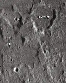 D'Arrest is a lunar impact crater that is located in the lava-flooded region to the west of the Mare Tranquillitatis. It is named after the German astronomer Heinrich Louis d'Arrest.[1] It lies to the southeast of the crater Agrippa and northwest of Delambre. Just to the northeast are the small, bowl-shaped craters De Morgan and Cayley.