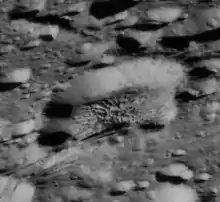 Dalilah is a crater in the northern hemisphere of Saturn's moon Enceladus. Dalilah was first discovered in Voyager 2 images but was seen at much higher resolution by Cassini. It is located at 51.89°N 248.54°W and is 16 kilometers across.[1] Fractures have deformed the south-eastern side of Dalilah as well as the dome at the center of the crater. This tectonic deformation was formed through viscous relaxation. Similar deformation is also seen on a slightly larger scale at Dunyazad crater.