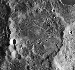 Parts of the interior floor of Darwin have been resurfaced. The southern floor of Darwin is only roughly level, with irregular surface features and several small craters. There is a dune-like set of hills in the northeast part of the floor, which is "decelerated surface-flow ejecta" from the Orientale basin impact that struck the eastern rim.[1] In the western floor is a large, low, somewhat irregular dome, one of the few such features not found on a mare. There is also the remnant of a small crater at the southern end of the floor.