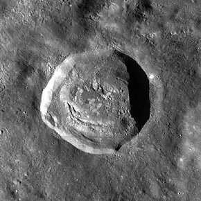 This crater lies at the center of a faint ray system. The higher albedo ejecta is continuous out to a distance of nearly two crater diameters, then forms wispy rays particularly to the northwest. These rays may overlap a second system to the east-southeast.