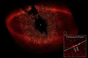 A debris disk (American English), or debris disc (Commonwealth English), is a circumstellar disk of dust and debris in orbit around a star. Sometimes these disks contain prominent rings, as seen in the image of Fomalhaut on the right. Debris disks are found around stars with mature planetary systems, including at least one debris disk in orbit around an evolved neutron star.[1] Debris disks can also be produced and maintained as the remnants of collisions between planetesimals, otherwise known as asteroids and comets.[2]