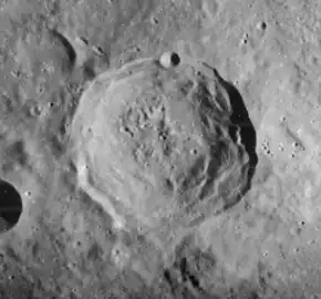 The rim of Delambre has a terraced interior, with a tiny craterlet lying along the northern rim. In the south is a low cut forming a slight notch. The crater interior has an irregular surface. It has high walls, with some peaks reaching 15,000 feet. Delambre was photographed by the uncrewed probe Ranger 8 on its descent towards Mare Tranquillitatis. Delambre is from the Upper Imbrian epoch, which lasted from 3.8 to 3.2 billion years ago.[2][3]