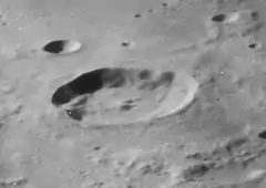 Democritus is named after the Greek philosopher of the same name. Like many of the craters on the Moon's near side, it was given its name by Giovanni Riccioli, whose 1651 nomenclature system has become standardized.[1] Earlier lunar cartographers had given the feature different names: Michael van Langren's 1645 map calls it "Alfonsi IX Reg. Cast." after Alfonso IX of León and Castile,[2] and Johannes Hevelius called it "Mons Bontas".[3]