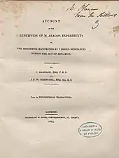 - Babbage, C.; Herschel, J.W.F. (1825). "Account of the repetition of M. Arago's experiments on the magnetism manifested by various substances during the act of rotation". Philosophical Transactions of the Royal Society of London. 115: 467–496. Bibcode:1825RSPT..115..467B. doi:10.1098/rstl.1825.0023.