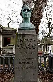 Arago remained a consistent republican to the end, and after the coup d'état of 1852, though suffering first from diabetes, then from Bright's disease, complicated by dropsy, he resigned his post as astronomer rather than take the oath of allegiance. Napoleon III gave directions that the old man should be in no way disturbed, and should be left free to say and do what he liked. In the summer of 1853 Arago was advised by his physicians to try the effect of his native air, and he accordingly set out to the eastern Pyrenees, but this was ineffective and he died in Paris. His grave is at the famous Père Lachaise Cemetery in Paris. Arago was an atheist.[16]