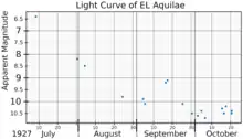 EL Aquilae, also known as Nova Aquilae 1927 was a nova that appeared in 1927. It was discovered by Max Wolf on photographic plates taken at Heidelberg Observatory on 30 and 31 July 1927 when it had a photographic magnitude of 9. Subsequent searches of plates taken at the Harvard College Observatory showed the nova was fainter than magnitude 11.1 on 8 June 1927 and had flared to magnitude 6.4 on 15 June 1927.[5][7] It declined from peak brightness at an average rate of 0.105 magnitudes per day, making it a fast nova, and ultimately dimmed to about magnitude 21.[2] The 14.5 magnitude change from peak brightness to quiescence was unusually large for a nova.[3]