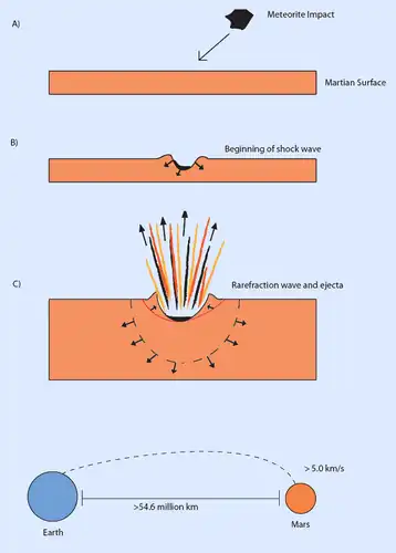 Impact and ejection sequence of a Martian meteorite. At time A, the impact of meteorite in imminent. At time B, the meteorite has impacted, melting and introducing a large amount of energy into the surface. This surface energy propagates as a shock wave. At time C, the shock wave continues to propagate, a rarefraction wave pushes back towards the crater in response, and material is ejected from the crater. If any of this material is moving at a rate faster than the escape velocity (5.0 km/s) of Mars, it may leave the influence of Martian gravity. Mars has a minimum distance from Earth of 54.6 million km that the ejecta would then have to travel with the perfect trajectory (dashed line) to impact on Earth. This is, in part, why Martian meteorites are rare on Earth.[1]