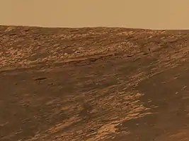 After arriving at the crater, Opportunity performed a survey of the crater to plan the further steps in exploring the local geology. A site dubbed "Karatepe" was chosen to enter the crater and investigate the layering of the bedrock.