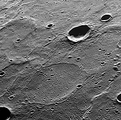 Oblique view showing Ensor (upper right) and Aristoxenus crater (bottom center)
