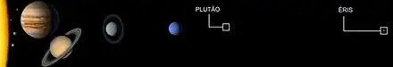 Eris (minor-planet designation: 136199 Eris) is the most massive and second-largest known dwarf planet in the Solar System.[22] It is a trans-Neptunian object (TNO) in the scattered disk and has a high-eccentricity orbit. Eris was discovered in January 2005 by a Palomar Observatory–based team led by Mike Brown and verified later that year. It was named in September 2006 after the Greco–Roman goddess of strife and discord. Eris is the ninth-most massive known object orbiting the Sun and the sixteenth-most massive overall in the Solar System (counting moons). It is also the largest known object in the solar system that has not been visited by a spacecraft. Eris has been measured at 2,326 ± 12 kilometers (1,445 ± 7 mi) in diameter;[12] its mass is 0.28% that of the Earth and 27% greater than that of Pluto,[23][24] although Pluto is slightly larger by volume.[25] Both Eris and Pluto have a surface area that is comparable to the area of Russia or South America.