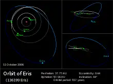Eris has an orbital period of 559 years.[20] Its maximum possible distance from the Sun (aphelion) is 97.5 AU, and its closest (perihelion) is 38 AU.[20] As the time of perihelion is defined at the epoch chosen using an unperturbed two-body solution, the further the epoch is from the date of perihelion, the less accurate the result. Numerical integration is required to predict the time of perihelion accurately. Numerical integration by JPL Horizons shows that Eris came to perihelion around 1699,[56] to aphelion around 1977, and will return to perihelion around December 2257.[11] Unlike those of the eight planets, whose orbits all lie roughly in the same plane as the Earth's, Eris's orbit is highly inclined: it is tilted at an angle of about 44 degrees to the ecliptic.[6] When discovered, Eris and its moon were the most distant known objects in the Solar System, apart from long-period comets and space probes.[2][57] It retained this distinction until the discovery of 2018 VG18 in 2018.[58]