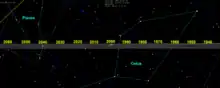 Because of the high inclination of its orbit, Eris passes through only a few constellations of the traditional Zodiac; it is now in the constellation Cetus. It was in Sculptor from 1876 until 1929 and Phoenix from roughly 1840 until 1875. In 2036 it will enter Pisces and stay there until 2065, when it will enter Aries.[64] It will then move into the northern sky, entering Perseus in 2128 and Camelopardalis (where it will reach its northernmost declination) in 2173.