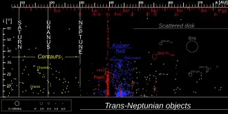 Eris is a trans-Neptunian dwarf planet. Its orbital characteristics more specifically categorize it as a scattered-disk object (SDO), or a TNO that has been "scattered" from the Kuiper belt into more-distant and unusual orbits following gravitational interactions with Neptune as the Solar System was forming. Although its high orbital inclination is unusual among the known SDOs, theoretical models suggest that objects that were originally near the inner edge of the Kuiper belt were scattered into orbits with higher inclinations than objects from the outer belt.[52]