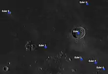 By convention these features are identified on lunar maps by placing the letter on the side of the crater midpoint that is closest to Euler.