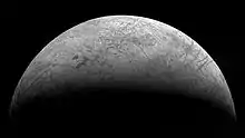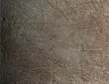 Europa is the smoothest known object in the Solar System, lacking large-scale features such as mountains and craters.[50] It has been postulated Europa's equator may be covered in icy spikes called penitentes, which may be up to 15 meters high, due to direct overhead sunlight on the equator, causing the ice to sublime, forming vertical cracks.[51][52][53] Although the imaging available from the Galileo orbiter does not have the resolution for confirmation, radar and thermal data are consistent with this speculation.[53] The prominent markings crisscrossing Europa appear to be mainly albedo features that emphasize low topography. There are few craters on Europa, because its surface is tectonically too active and therefore young.[54][55] Its icy crust has an albedo (light reflectivity) of 0.64, one of the highest of any moon.[39][55] This indicates a young and active surface: based on estimates of the frequency of cometary bombardment that Europa experiences, the surface is about 20 to 180 million years old.[56] There is no scientific consensus about the explanation for Europa's surface features.[57]