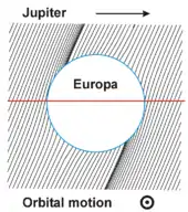 Europa orbits Jupiter in just over three and a half days, with an orbital radius of about 670,900 km. With an orbital eccentricity of only 0.009, the orbit itself is nearly circular, and the orbital inclination relative to Jupiter's equatorial plane is small, at 0.470°.[39] Like its fellow Galilean satellites, Europa is tidally locked to Jupiter, with one hemisphere of Europa constantly facing Jupiter. Because of this, there is a sub-Jovian point on Europa's surface, from which Jupiter would appear to hang directly overhead. Europa's prime meridian is a line passing through this point.[40] Research suggests that tidal locking may not be full, as a non-synchronous rotation has been proposed: Europa spins faster than it orbits, or at least did so in the past. This suggests an asymmetry in internal mass distribution and that a layer of subsurface liquid separates the icy crust from the rocky interior.[11]