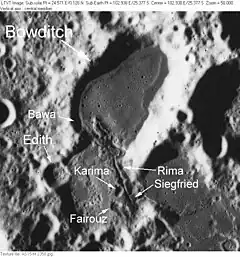 By convention these features are identified on lunar maps by placing the letter on the side of the crater midpoint that is closest to Bowditch.