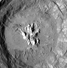 Fonteyn crater interior, showing detail of the central peak complex and texture of the impact melt on the crater floor.