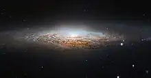 Herschel also studied the structure of the Milky Way and was the first to propose a model of the galaxy based on observation and measurement.[93] He concluded that it was in the shape of a disk, but incorrectly assumed that the Sun was in the centre of the disk.[94][95][96][97] This heliocentric view was eventually replaced by galactocentrism due to the work of Harlow Shapley, Heber Doust Curtis and Edwin Hubble in the 20th century. All three men used significantly more far-reaching and accurate telescopes than Herschel's.[94][95][98]